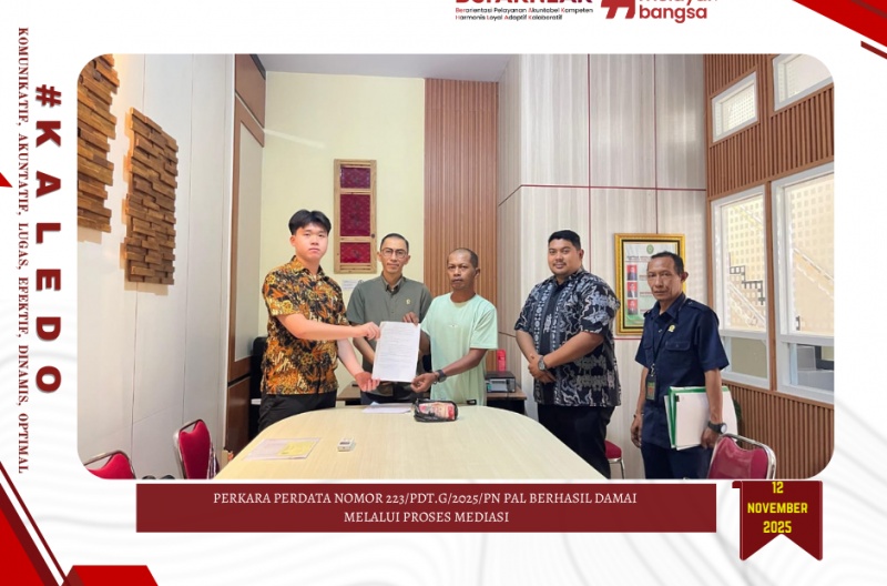 Palu, 12 November 2025 – Bertempat di Ruang Mediasi Pengadilan Negeri Palu, Hakim Mediator Bapak Sudirman, S.H. berhasil memediasi perkara Nomor 223/Pdt.G/2025/PN Pal yang berkaitan dengan Perbuatan Melawan Hukum.
