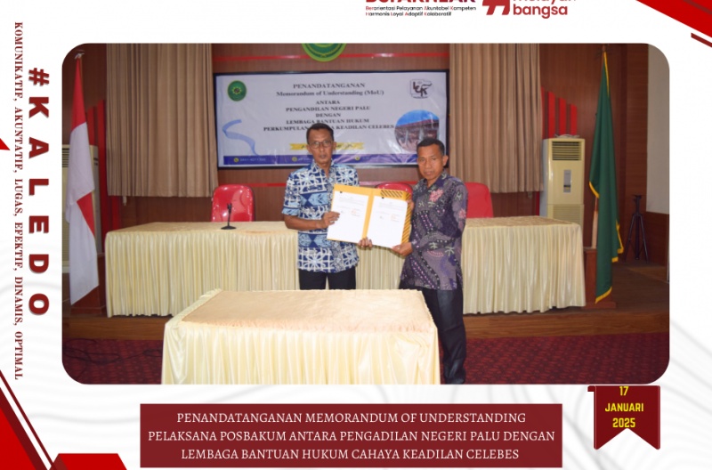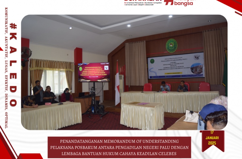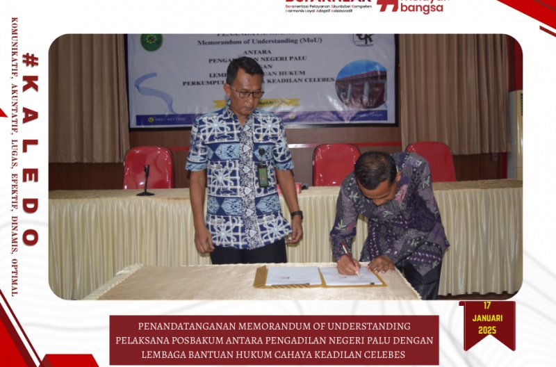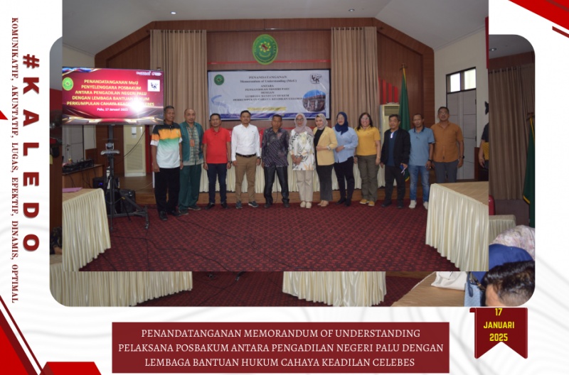 Palu, 17 Januari 2025, bertempat di Room Meeting Pengadilan Negeri Palu telah dilaksankan Penandatanganan Memorandum of Understanding Pelaksana Pos Bantuan Hukum antara Pengadilan Negeri Palu dengan Lembaga Bantuan Hukum Cahaya Keadilan Celebes.