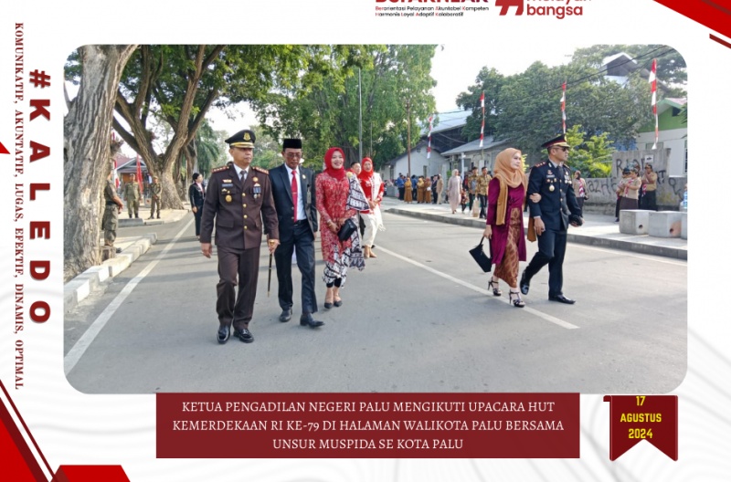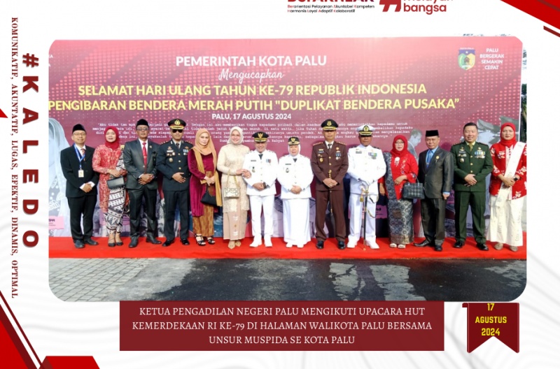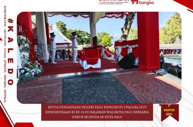 Palu, 17 Agustus 2024 Ketua pengadilan Negeri Palu mengikuti Upacara Peringatan HUT Kemerdekaan RI ke-79 bersama unsur Muspida Kota Palu di Halaman Kantor Walikota Palu.