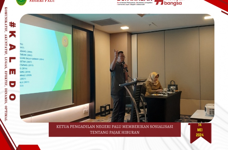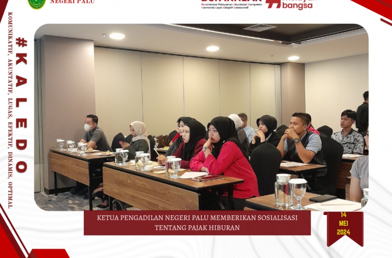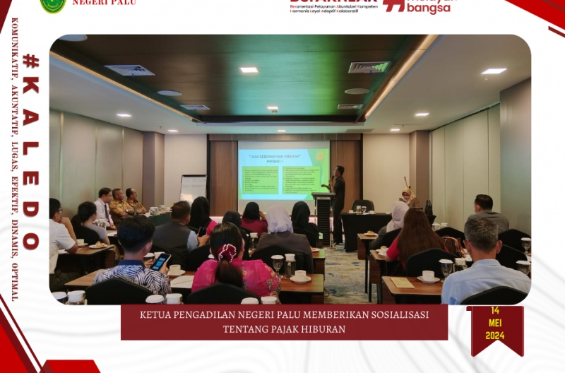 Palu, 14 Mei 2024 bertempat di Hotel Aston Jl. Monginsidi Palu Ketua Pengadilan Negeri Palu YM Bpk. Chairil Anwar, S.H., M.Hum. memberikan sosialisasi Pajak Hiburan terkait Undang-Undang Nomor 1 Tahun 2022 tentang Hubungan Keuangan Pusat dan Daerah serta Peraturan Daerah Nomor 9 Tahun 2023 tentang Pajak Daerah dan Retribusi Daerah.